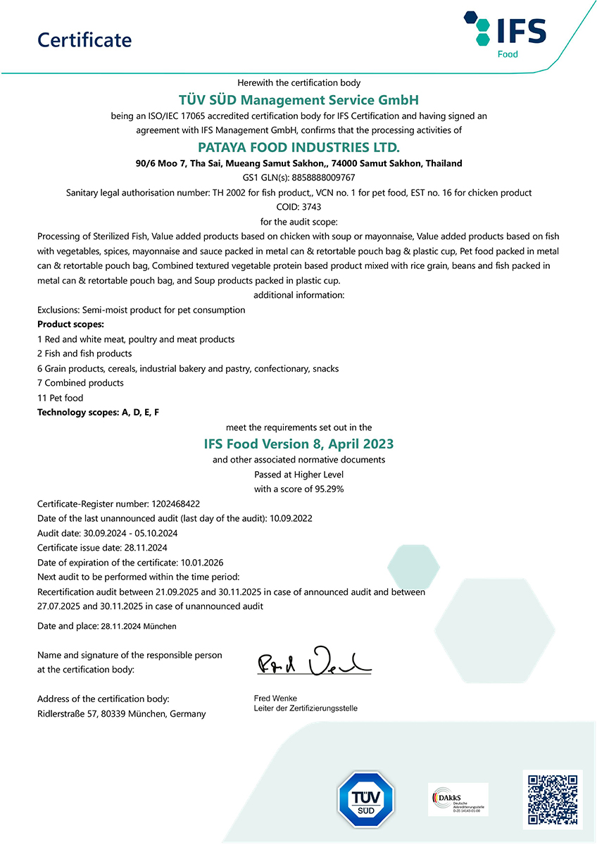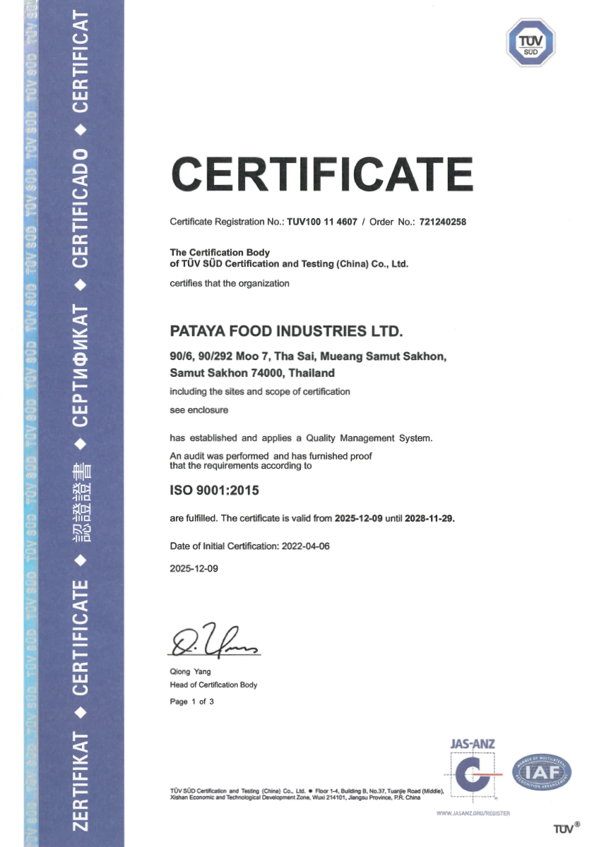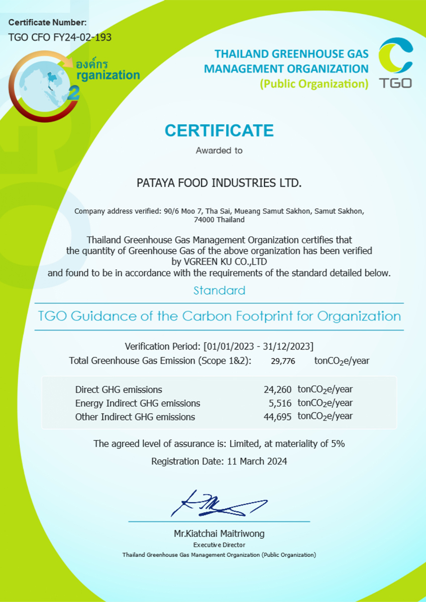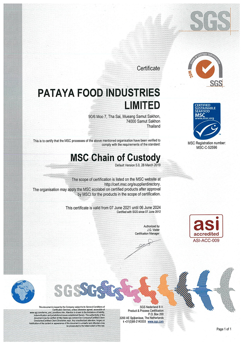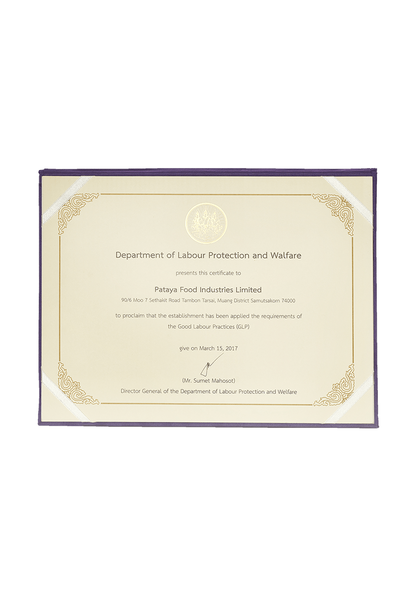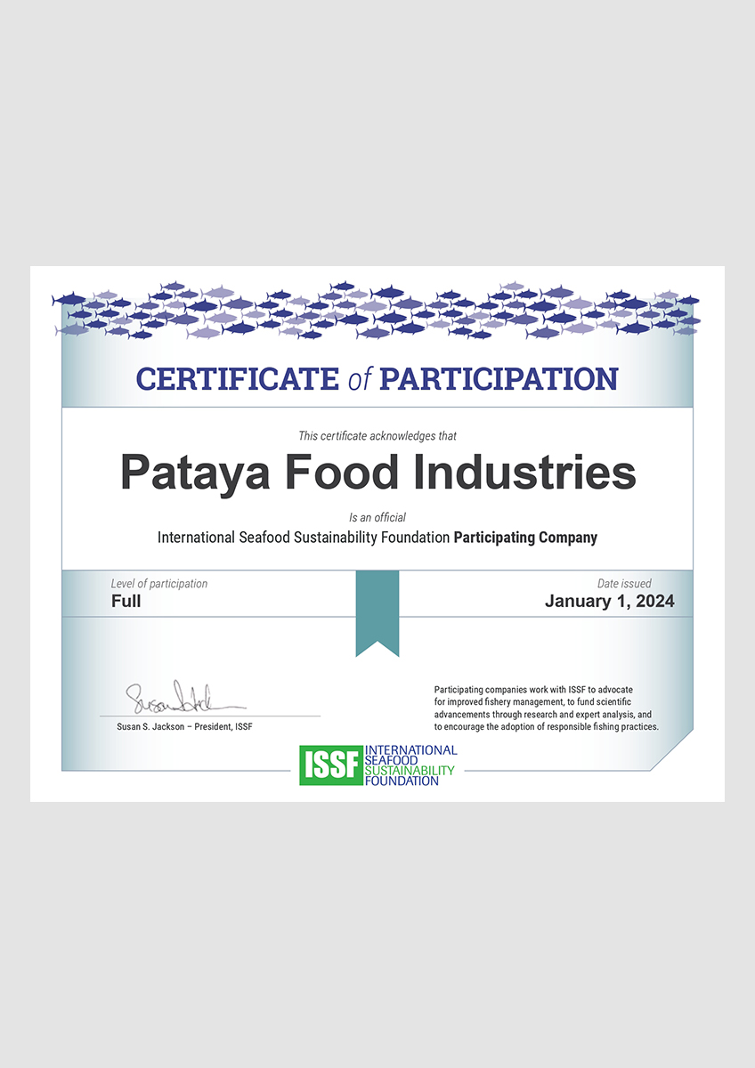 ด้วยความมุ่งมั่นและพัฒนาในการดำเนินธุรกิจมา ตลอดระยะเวลา 40 กว่าปี ทำให้ กลุ่มบริษัท พัทยาฟู้ด (PFG- Pataya Food Group) ได้รับการยอมรับในมาตรฐานระดับสากลจากสถาบันรับรองมาตรฐานชั้นนำต่างๆ ทั้งในประเทศ และ ต่างประเทศหลากหลายด้าน เช่น GMP , HACCP , BRC , IFS , ISO 22000 , ISO 9001 , Orthodox Union, MSC และ Halal
