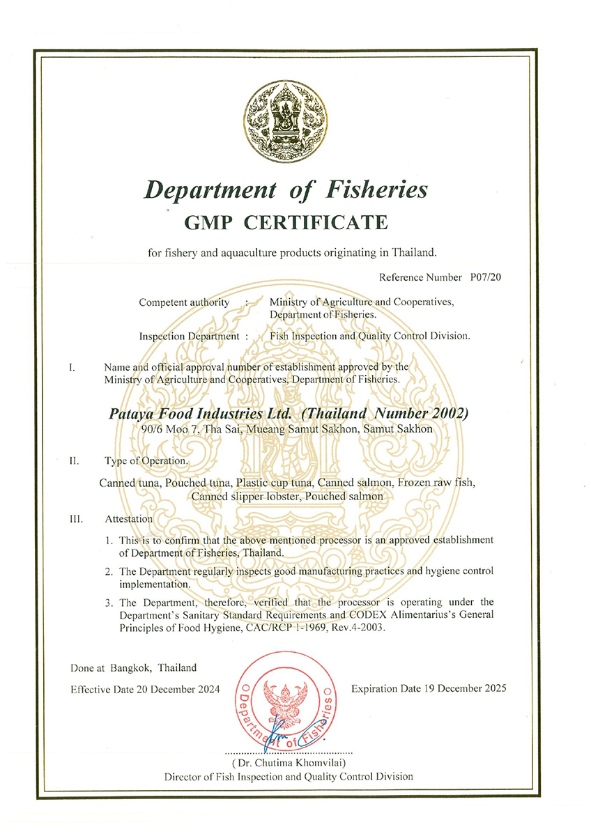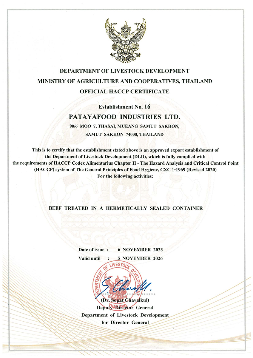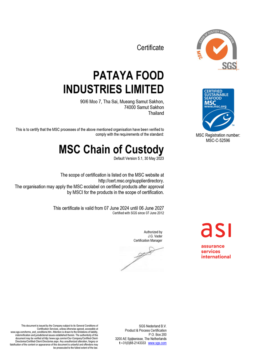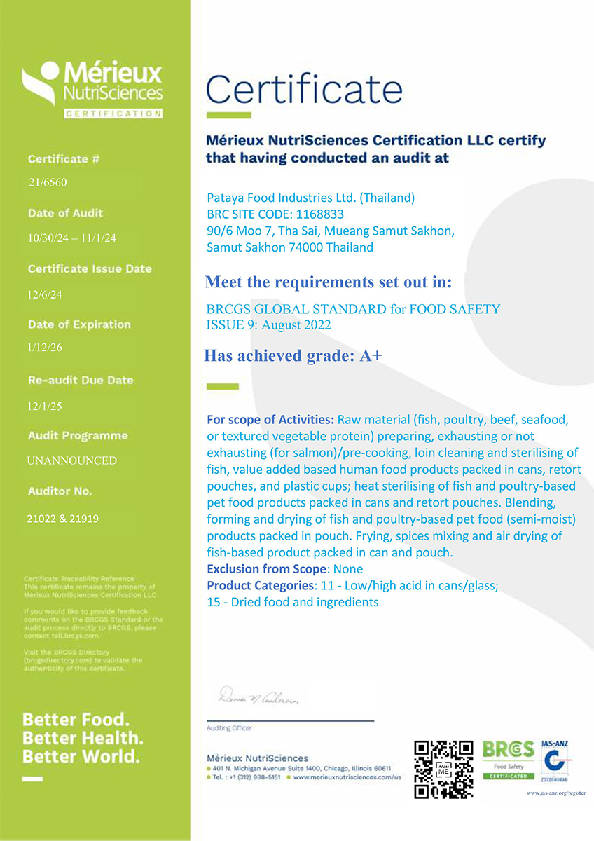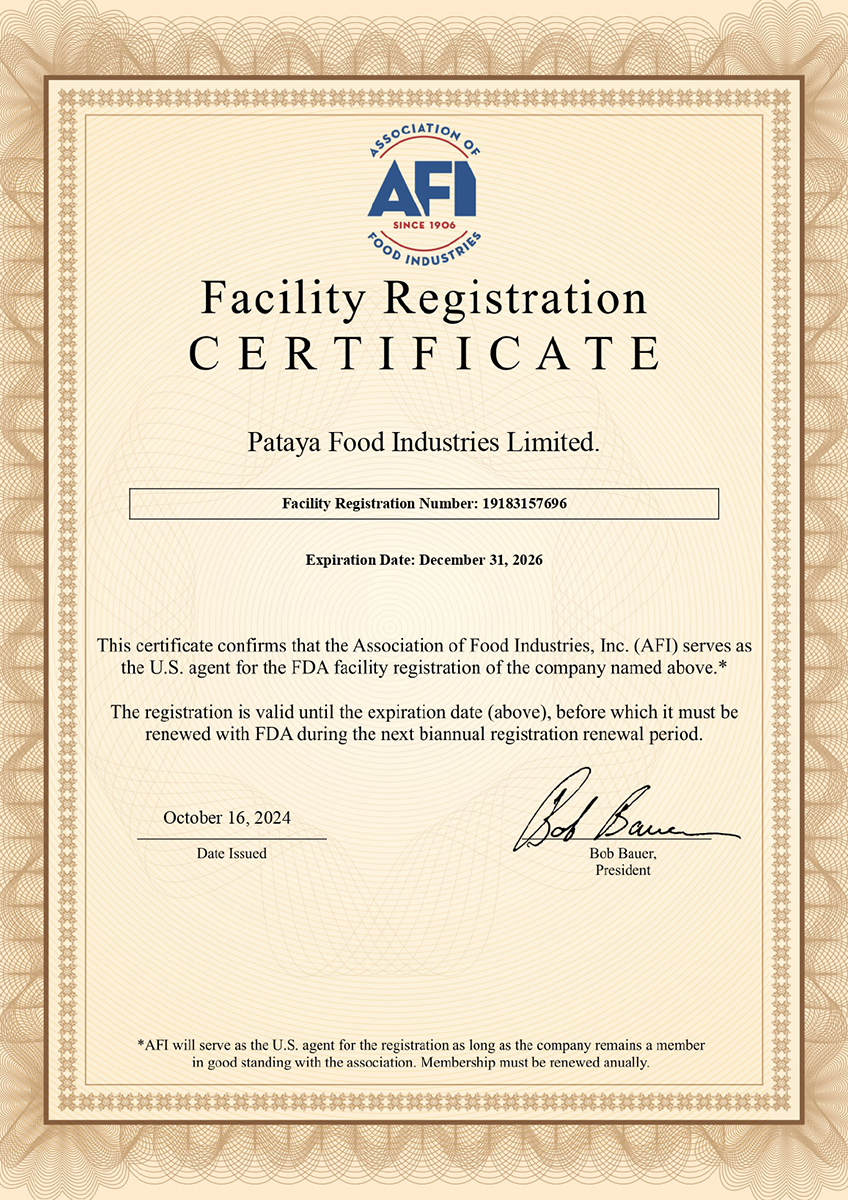 ด้วยความมุ่งมั่นและพัฒนาในการดำเนินธุรกิจมา ตลอดระยะเวลา 40 กว่าปี ทำให้ กลุ่มบริษัท พัทยาฟู้ด (PFG- Pataya Food Group) ได้รับการยอมรับในมาตรฐานระดับสากลจากสถาบันรับรองมาตรฐานชั้นนำต่างๆ ทั้งในประเทศ และ ต่างประเทศหลากหลายด้าน เช่น GMP , HACCP , BRC , IFS , ISO 22000 , ISO 9001 , Orthodox Union, MSC และ Halal