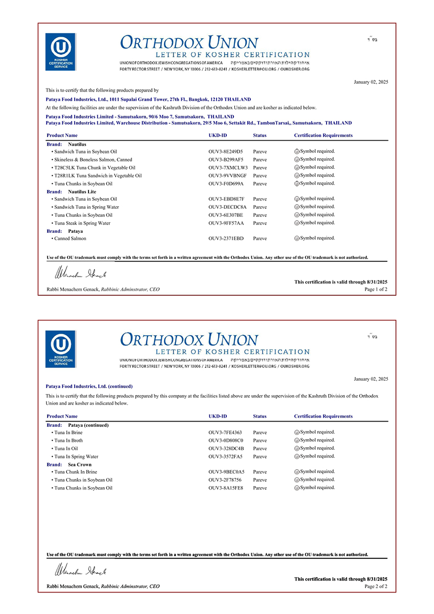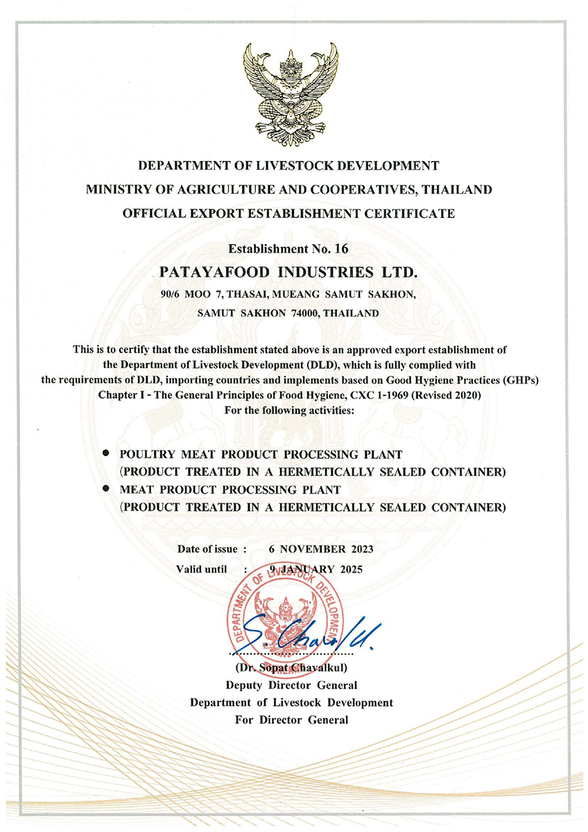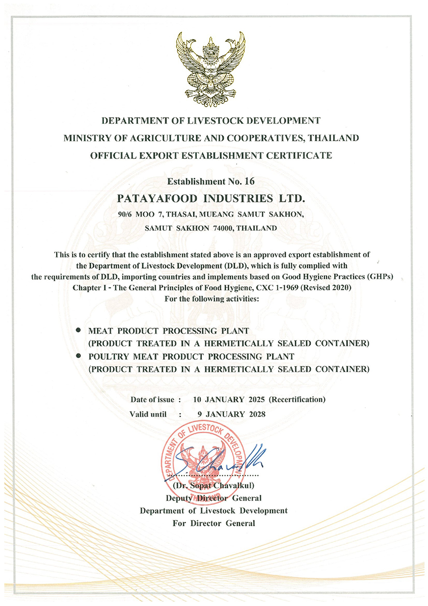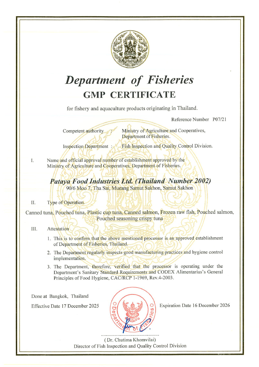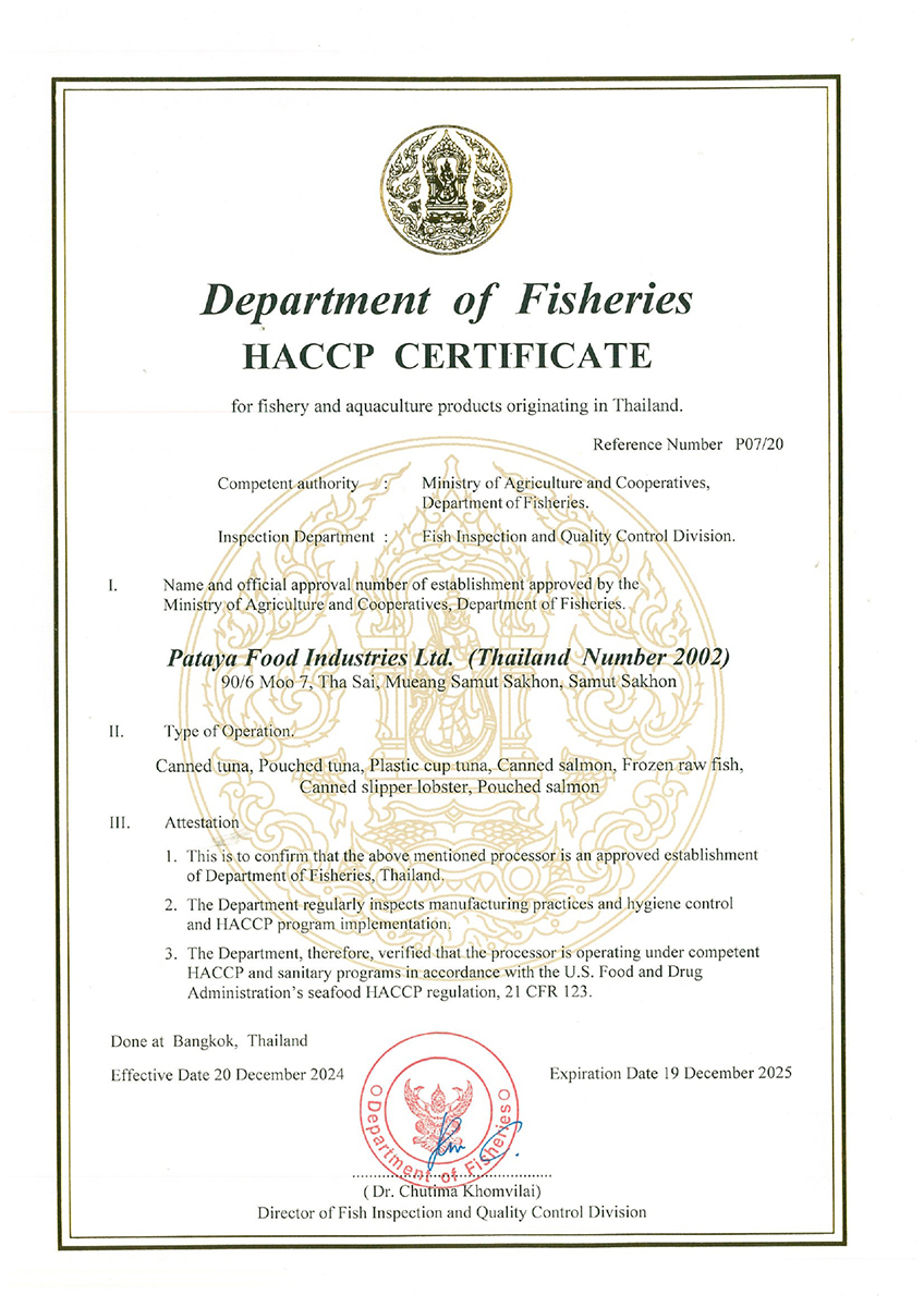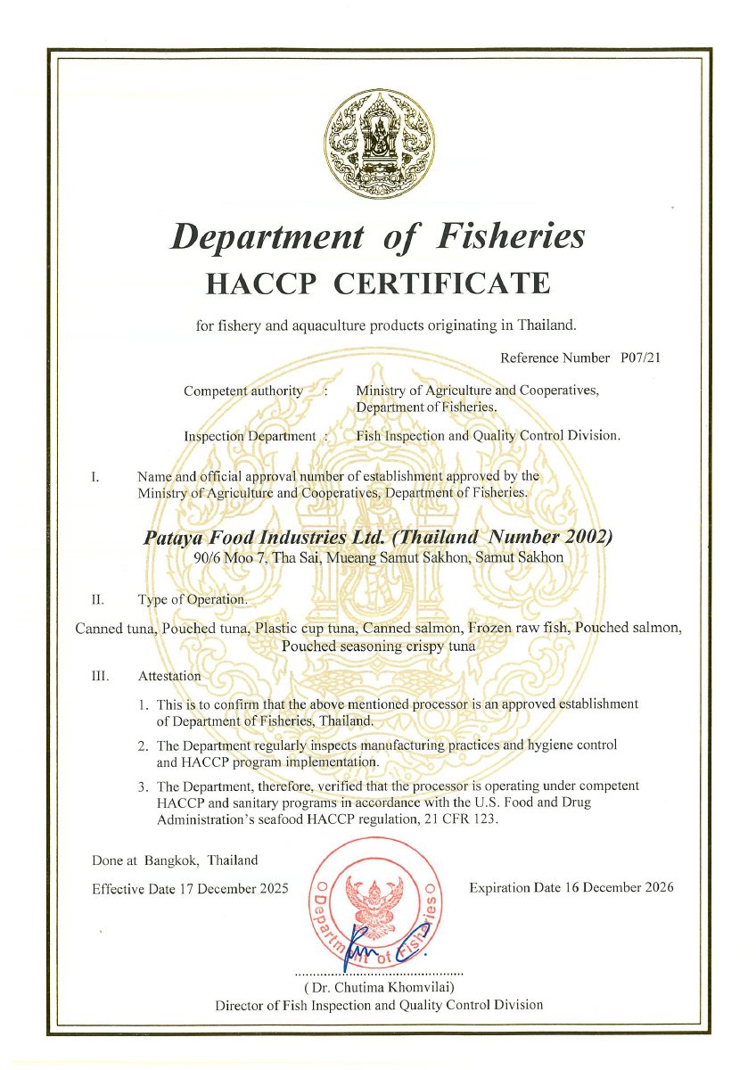 ด้วยความมุ่งมั่นและพัฒนาในการดำเนินธุรกิจมา ตลอดระยะเวลา 40 กว่าปี ทำให้ กลุ่มบริษัท พัทยาฟู้ด (PFG- Pataya Food Group) ได้รับการยอมรับในมาตรฐานระดับสากลจากสถาบันรับรองมาตรฐานชั้นนำต่างๆ ทั้งในประเทศ และ ต่างประเทศหลากหลายด้าน เช่น GMP , HACCP , BRC , IFS , ISO 22000 , ISO 9001 , Orthodox Union, MSC และ Halal