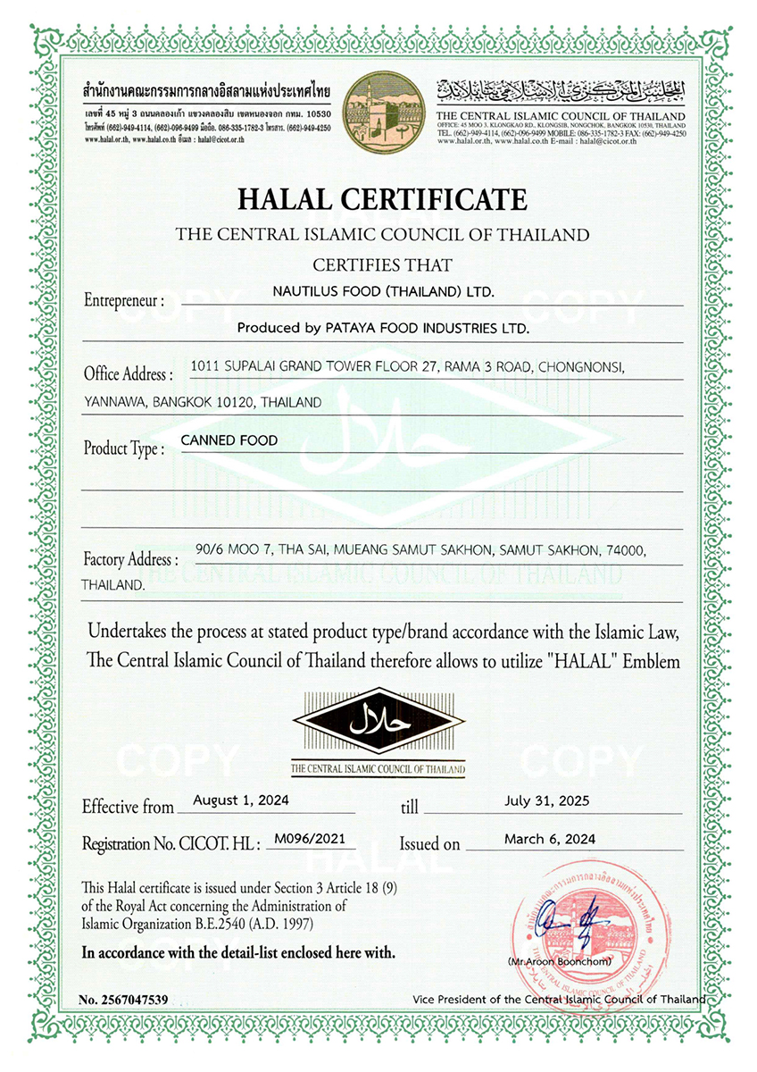 ด้วยความมุ่งมั่นนี้ นำมาซึ่งการยอมรับในระดับสากล ด้วยการสร้างสรรค์คุณค่าให้กับอาหารทุกมื้อ ผลิตภัณฑ์คุณภาพที่เราภูมิใจเสนอจะเป็นส่วนหนึ่งที่สำคัญอันจะนำไปสู่การมีสุขภาพและคุณภาพชีวิตที่ดีและมีความสุข กลุ่มพัทยาฟู้ดมีความภูมิใจที่จะส่งมอบผลิตภัณฑ์ที่มีคุณภาพดีที่สุดเพื่อผู้บริโภค ไม่ว่าจะเป็นสินค้าที่เป็นแบรนด์ของกลุ่มบริษัทพัทยาฟู้ด เช่น นอติลุส, ซีคราวน์, มงกุฎทะเล และ รีกาลอส หรือกลุ่มสินค้าที่เรารับจ้างผลิต (OEM) ด้วยหลักการที่มุ่งหวังที่จะส่งเสริมคุณภาพชีวิตและพร้อมเติมเต็มสิ่งที่ดีให้แก่ผู้บริโภคทุกกลุ่ม