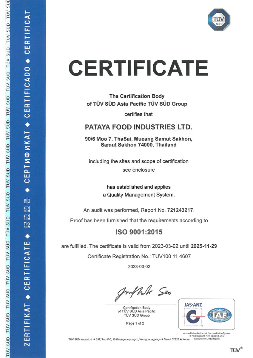 With commitment and improvement throughout 40 years of its operations, PFG - Pataya Food Group has been acknowledged on its international standard from accredited institutes both locally and internationally such as GMP , HACCP , BRC , IFS , ISO 22000 , ISO 9001 , Orthodox Union, MSC and Halal as an assurance on PFG - Pataya Food Group’s commitment to quality